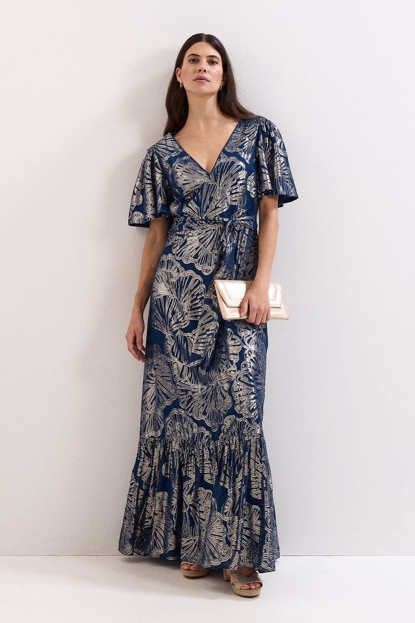 A stunning maxi wrap dress in dark navy with a V-neckline and flutter sleeves. Its shimmering fil coup pattern adds an evening allure. Ideal for special occasions.