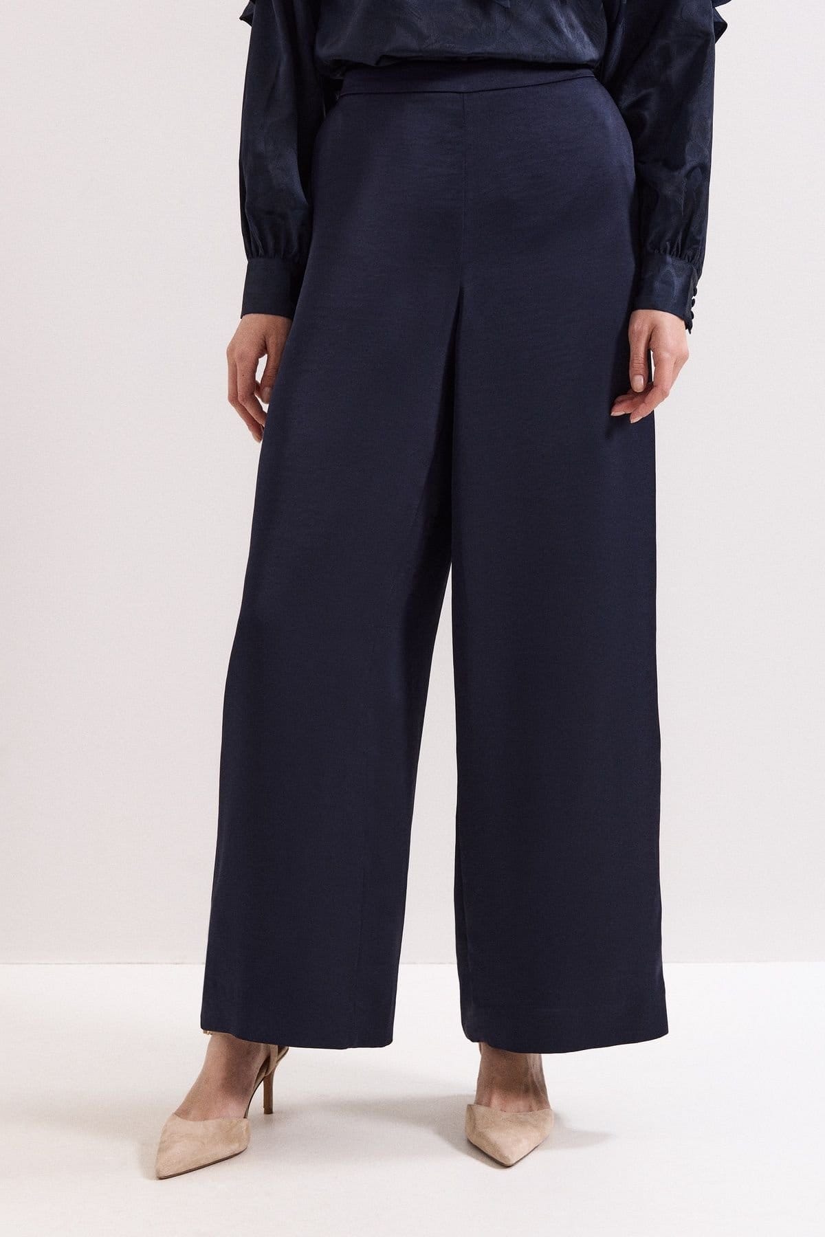 The Phase Eight Dark Navy Satin Wide-Leg Trousers is available in sizes 10, 12, 14, 16.