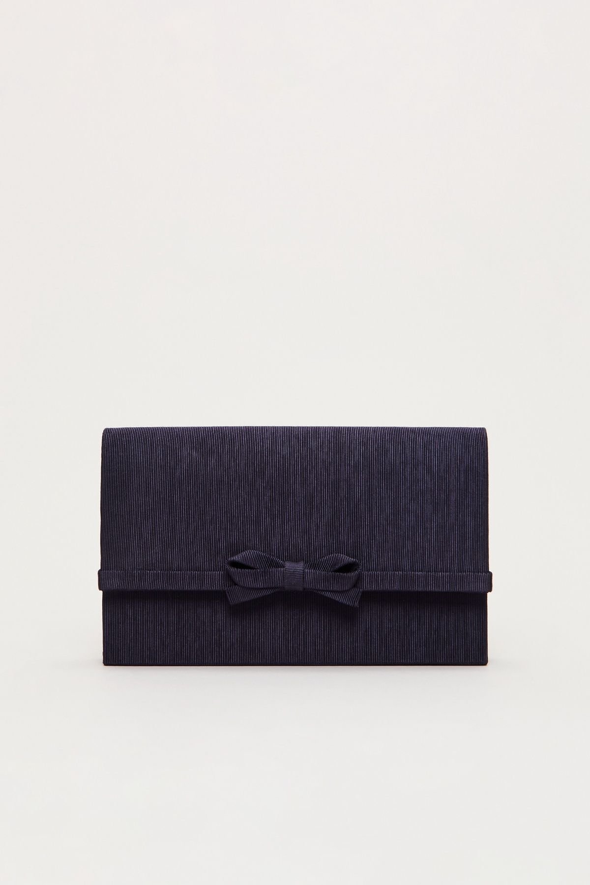 Timeless Phase Eight clutch bag in dark navy with a bow detail and gold chain. Features a luxe satin lining and concealed magnetic clasp. Perfect for any occasion.