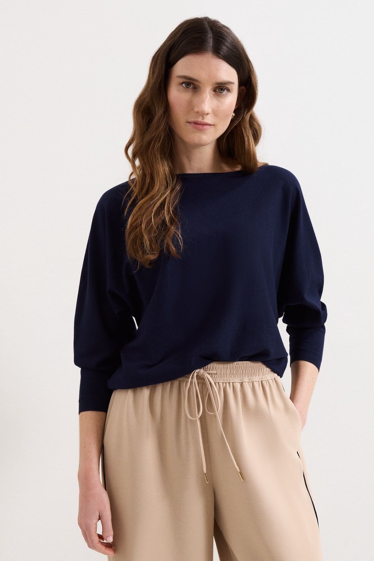 Timeless Phase Eight jumper in dark navy featuring a modern slashed neckline and batwing sleeves. Made from soft, knitted fabric, it's perfect for layering over smart trousers or denim for an elevated everyday look.