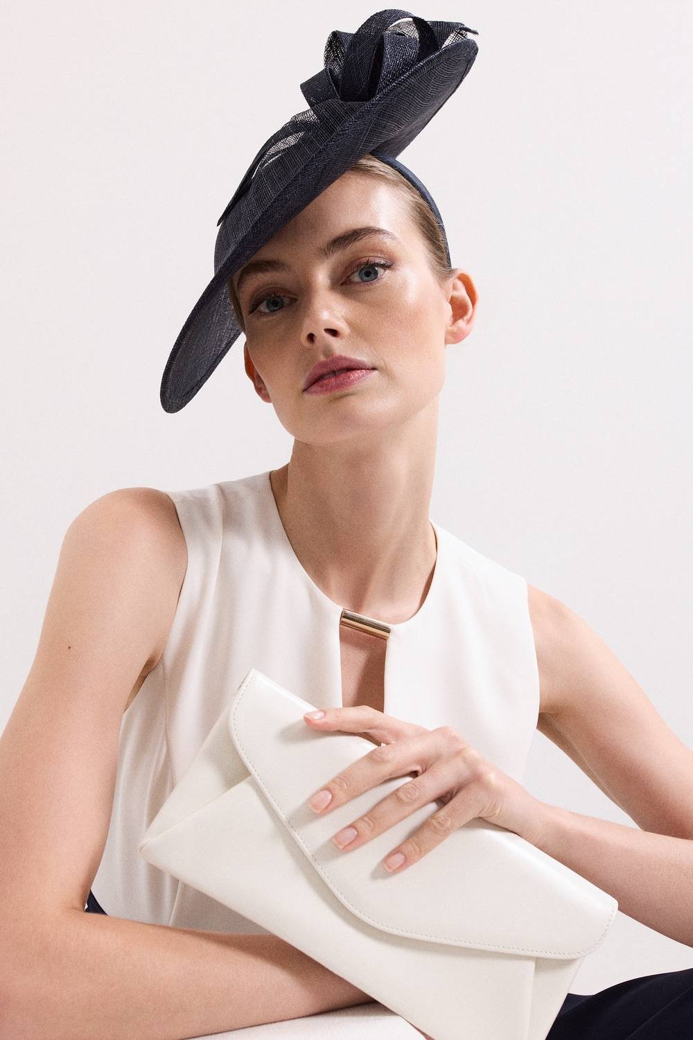 Elegant dark navy fascinator headband by Phase Eight. This airy, sculptural accessory features a disc design with a delicate bow, perfect for special occasions.
