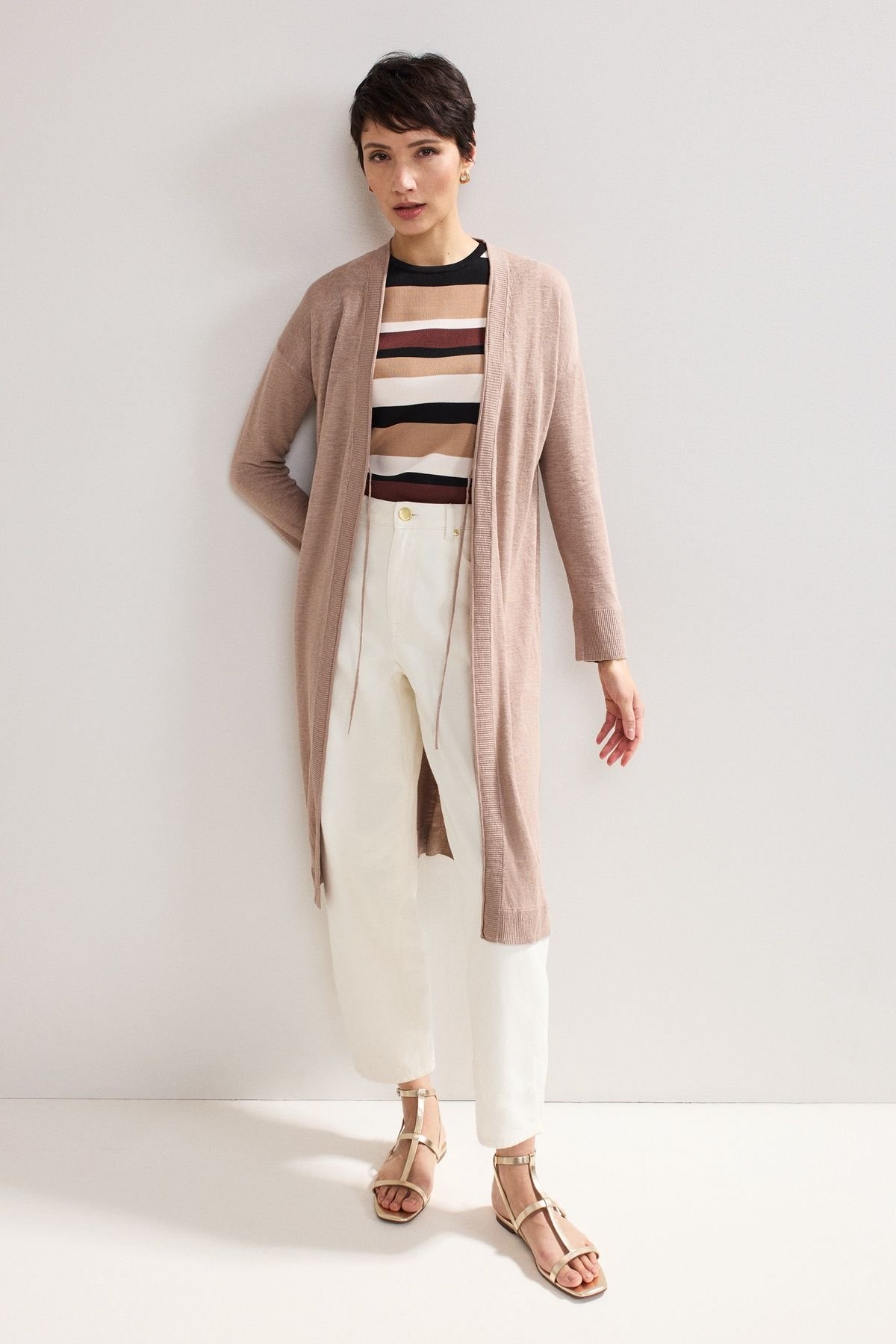 Lightweight linen-blend cardigan in a soft fawn colour, featuring a longline silhouette and tie-front closure. Ideal for versatile day-to-night wear.