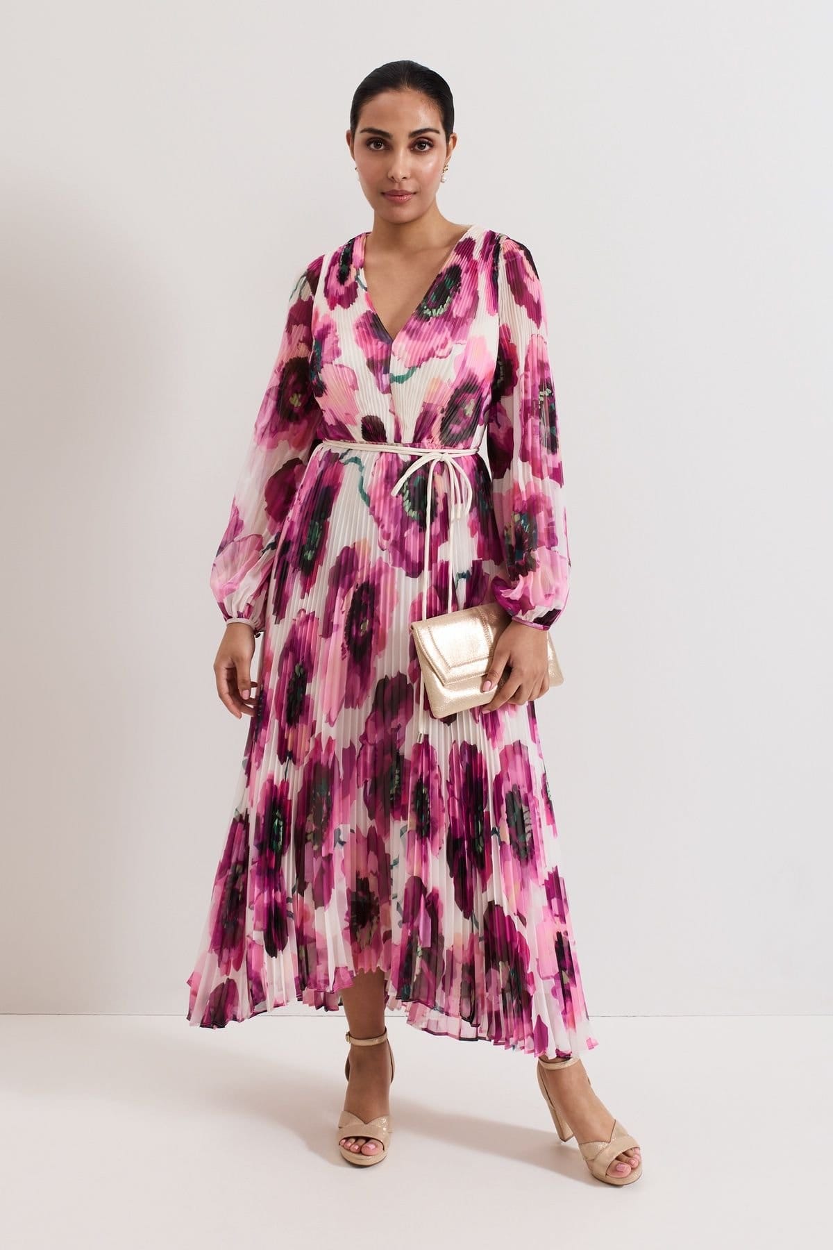The Phase Eight Fuchsia Floral Pleated Tie-Waist Dress is available in sizes 10, 12, 14, 16, 18, 20.
