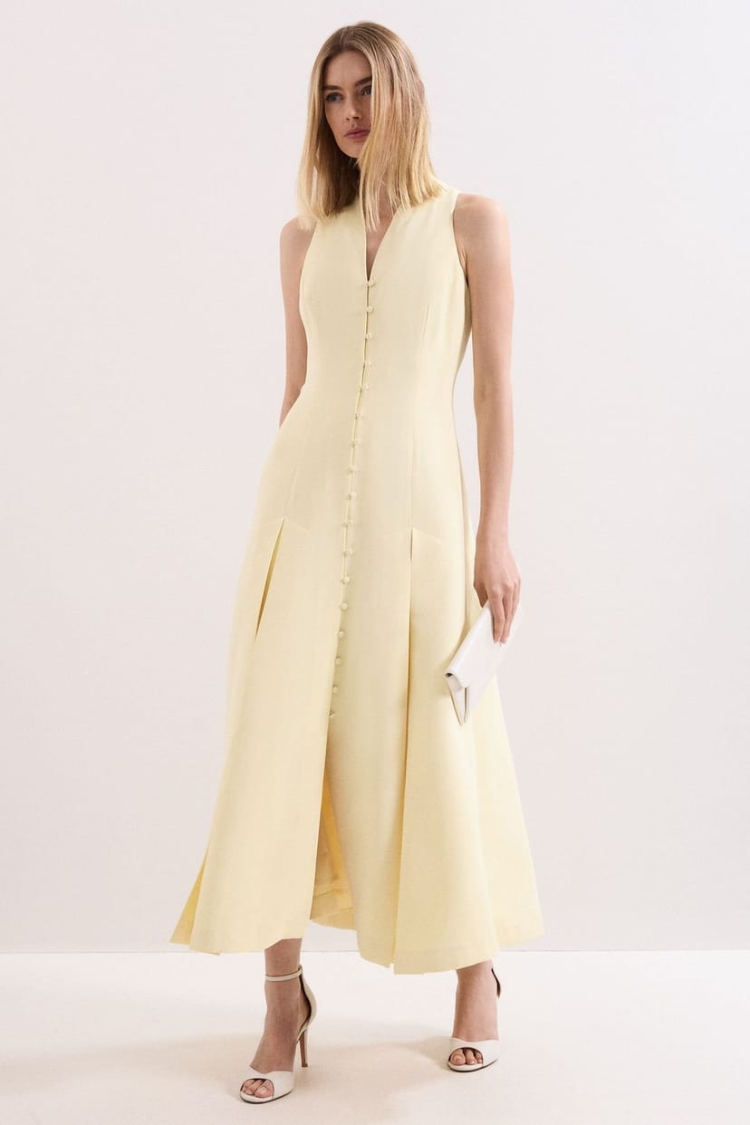 Sleek Phase Eight maxi dress in vibrant lemon hue. Features a button-front design with elegant pleats for a modern formal look. Ideal for memorable occasions.