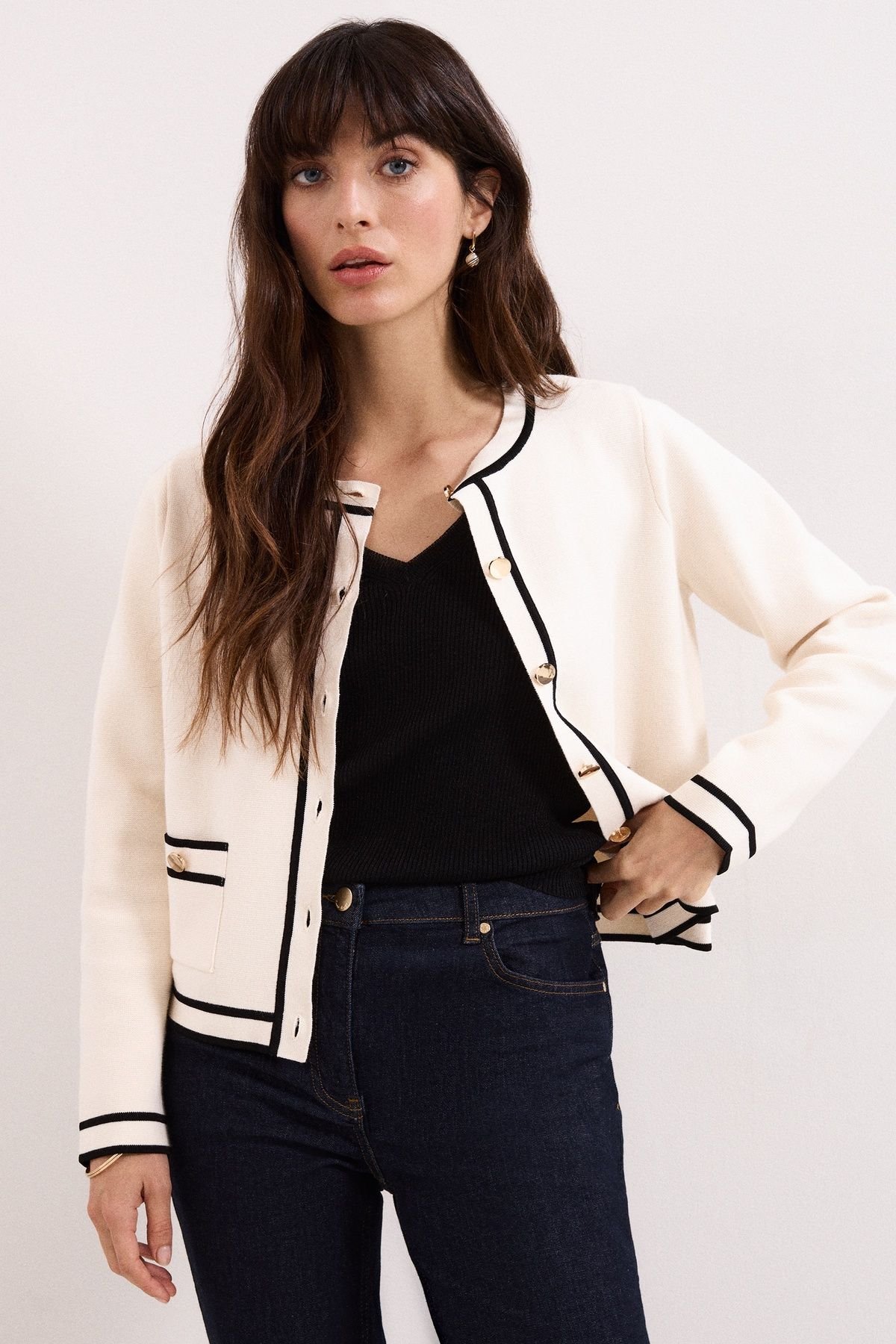 This chic Phase Eight cardigan features a luxe cotton-blend and a relaxed fit. It boasts a timeless round neckline, front pockets, and a modern button fastening. The contrast detailing adds a contemporary edge.