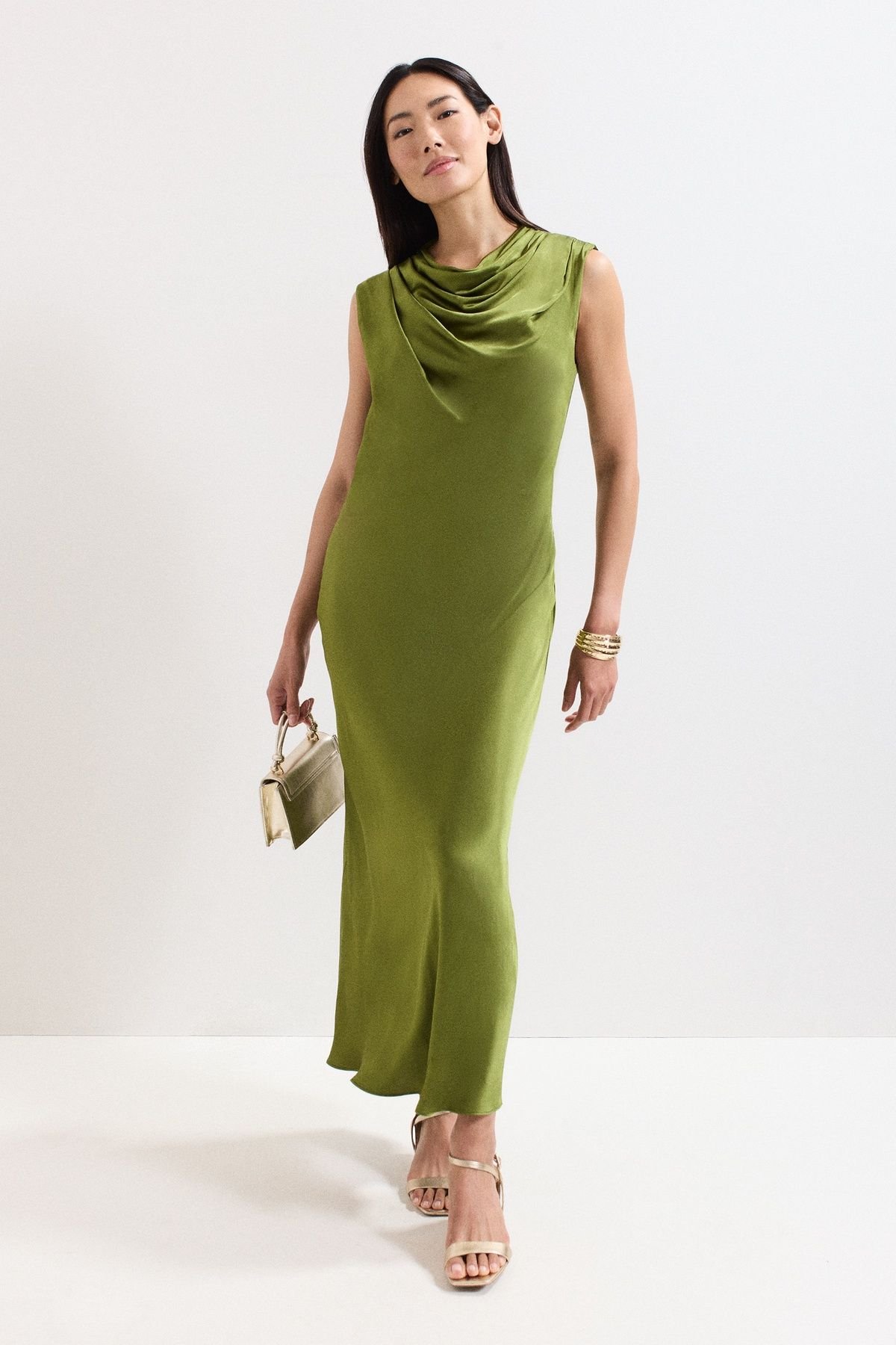 The Phase Eight Olive Satin Cowl Neck Midi Dress is made from satin.