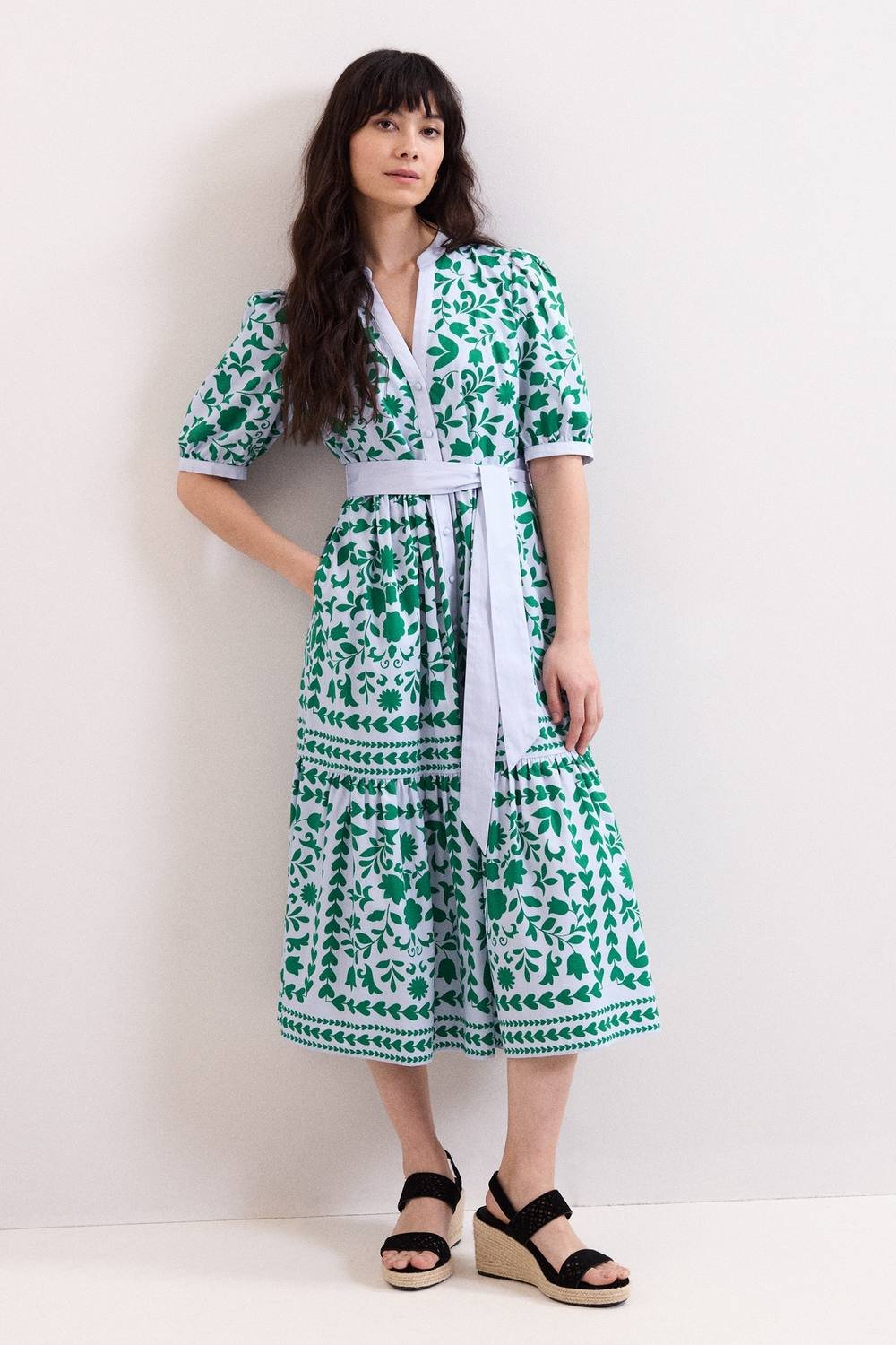 Charming midi dress in pale blue with a floral print. Features a belted waist, V-neckline, and puff sleeves. Ideal for sunlit weekends and garden gatherings.