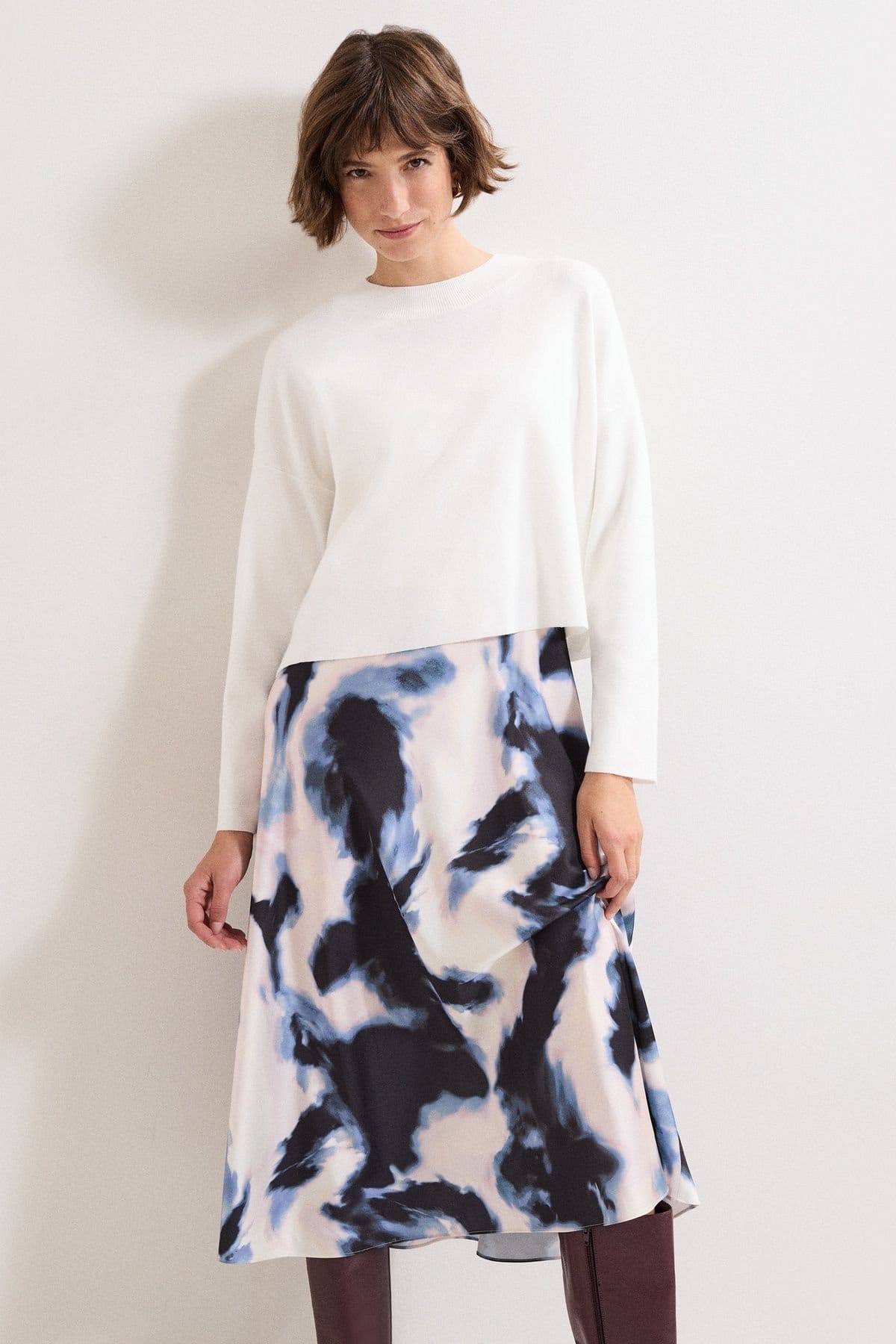Versatile 2-in-1 midi dress in pale pink with a beautiful abstract print skirt designed in luxe woven satin. Features a simple, sophisticated bodice with a detachable soft, white knit. Perfect for transitional looks or taking you from sunny days to chilly nights.