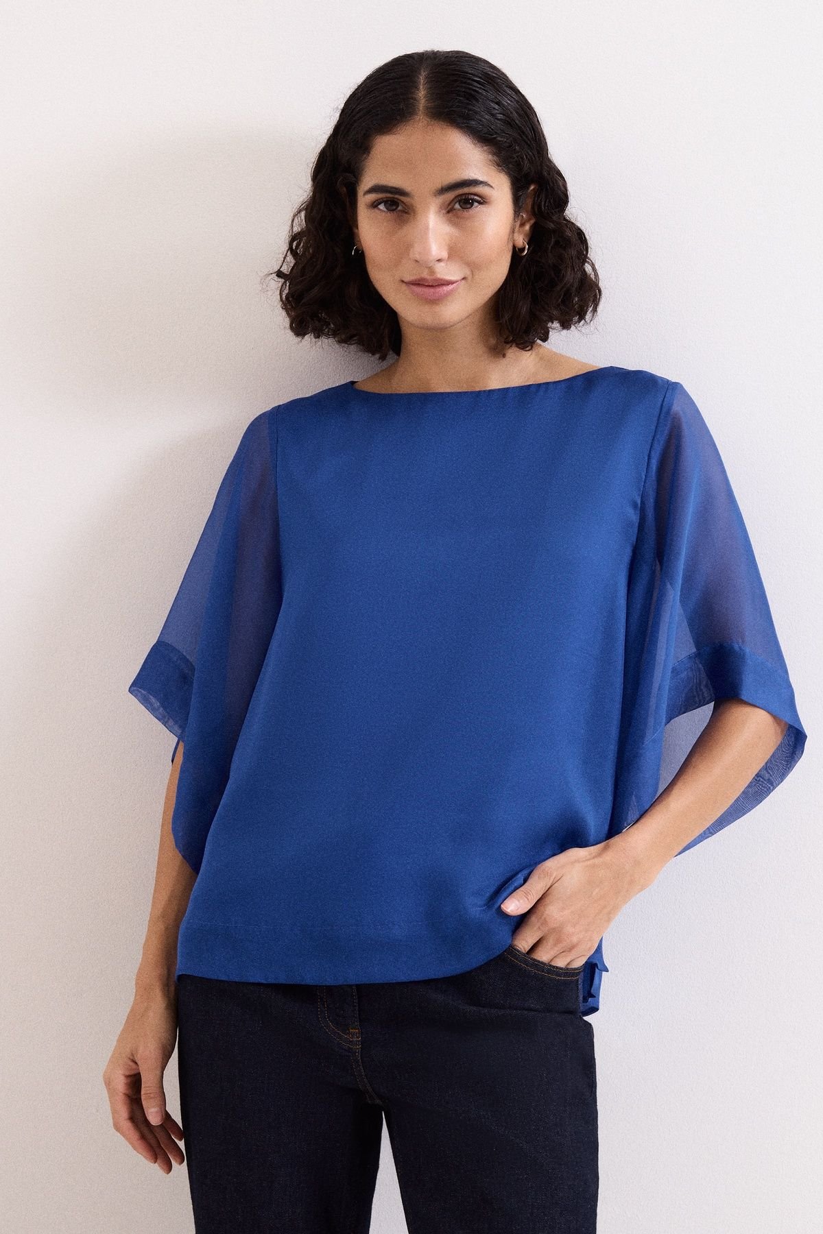 Luxurious silk blouse in royal blue with a contemporary relaxed silhouette. Features unique length sheer sleeves. Perfect for versatile yet striking styling.