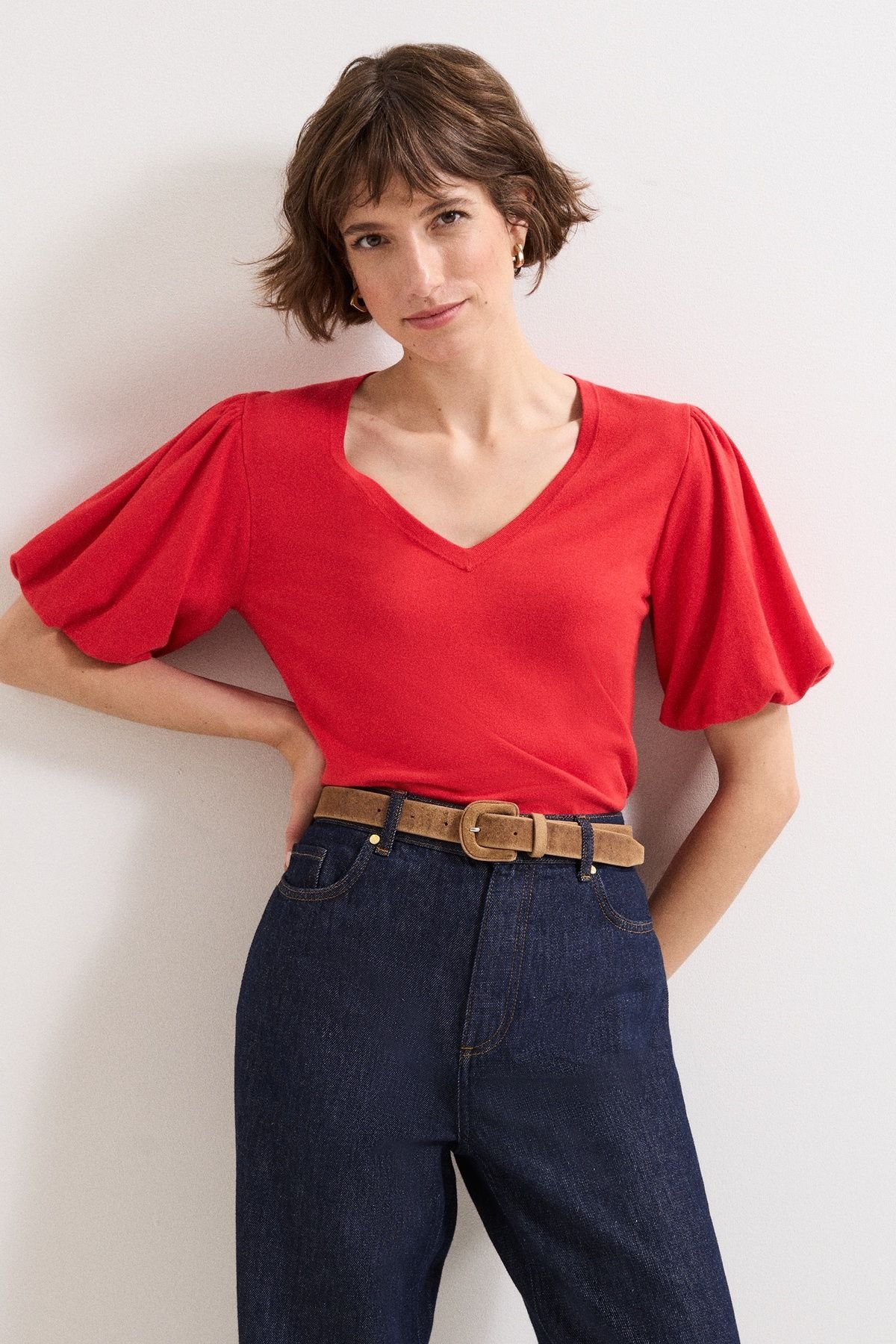 Vibrant scarlet fitted top in a soft, lightweight knit. Features a feminine V-neckline and puff sleeves. Perfect for layering or wearing alone.