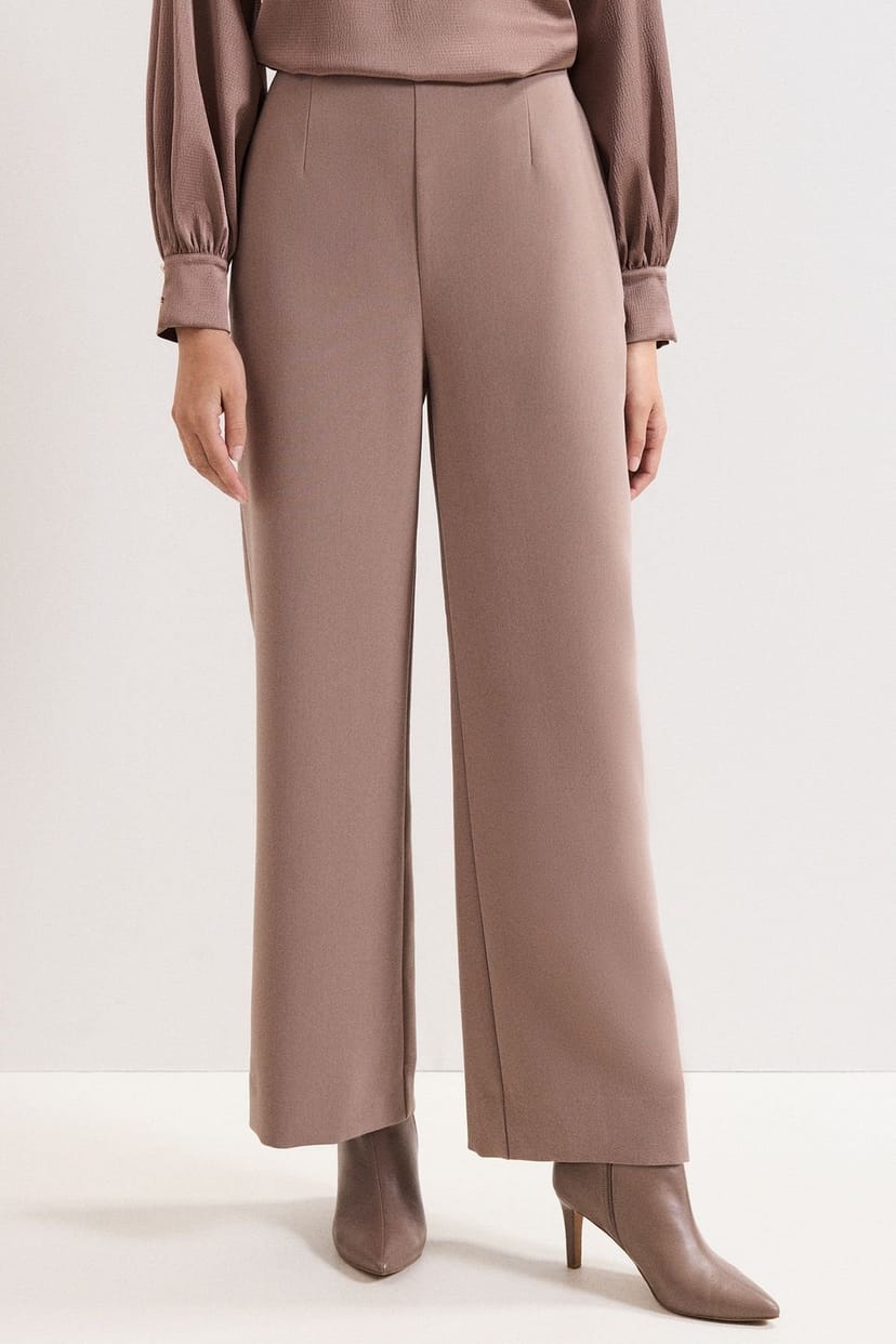 Stylish full-length trousers in taupe featuring a straight-leg silhouette and elegant darting. Designed for a tailored fit with an easy elasticated back for comfort. Perfect for transitioning from day to night.