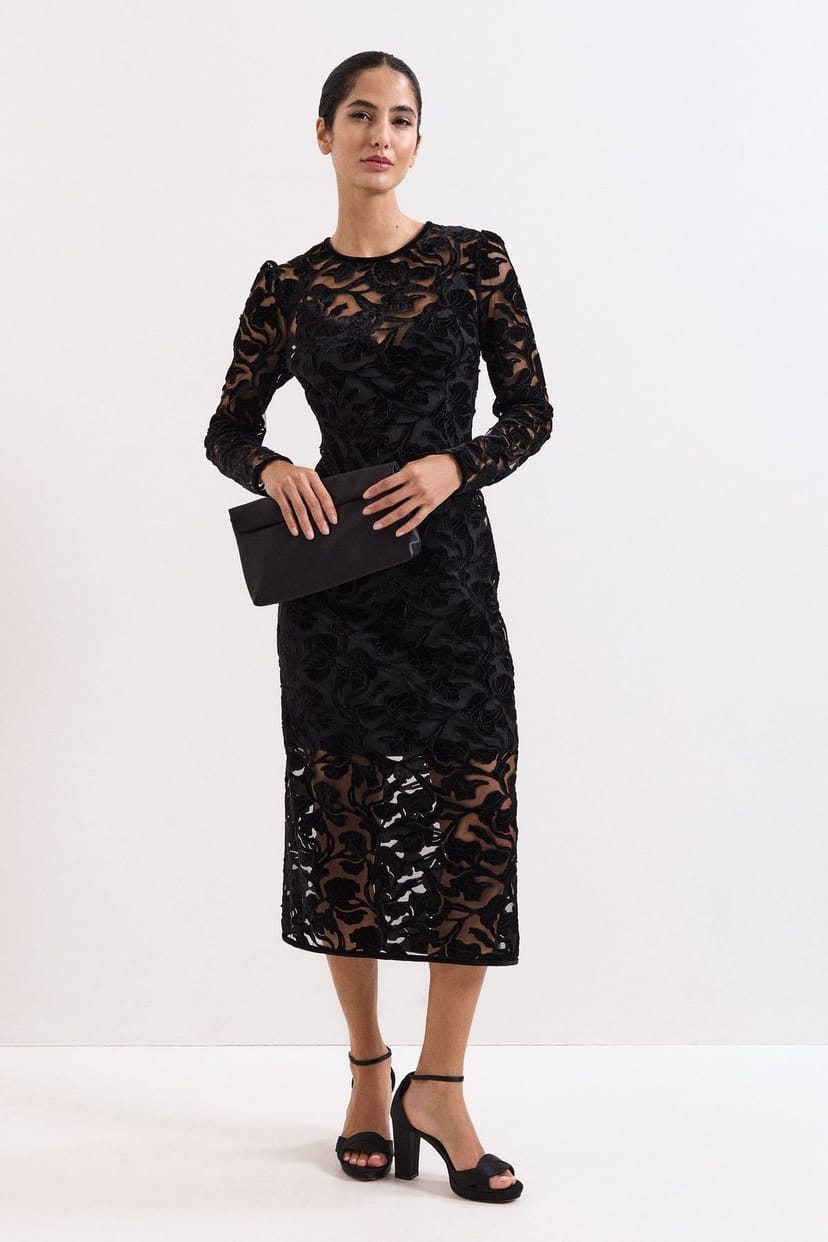 Sophisticated lace midi dress in true black featuring a round neckline and long sleeves. The semi sheer overlay with a leaf design adds a feminine allure. Perfect for a monochromatic event look.