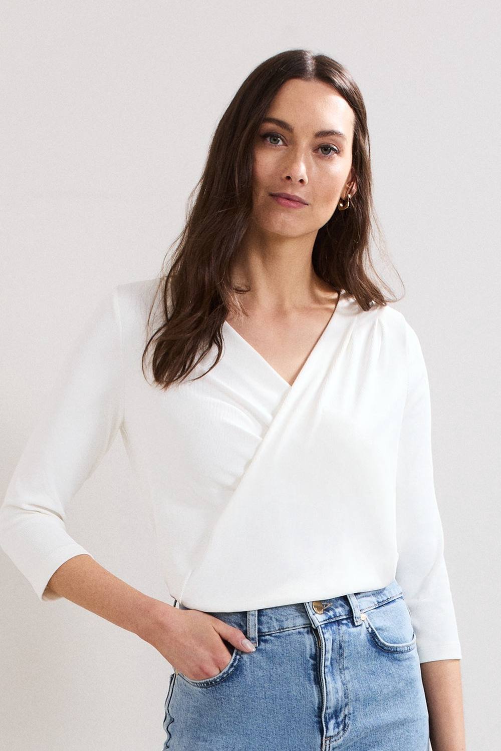 Stylish Phase Eight top in white with a V-neckline and 3/4 sleeves. Made from ribbed fabric, it features feminine draping for a flattering fit. Ideal for everyday wear.
