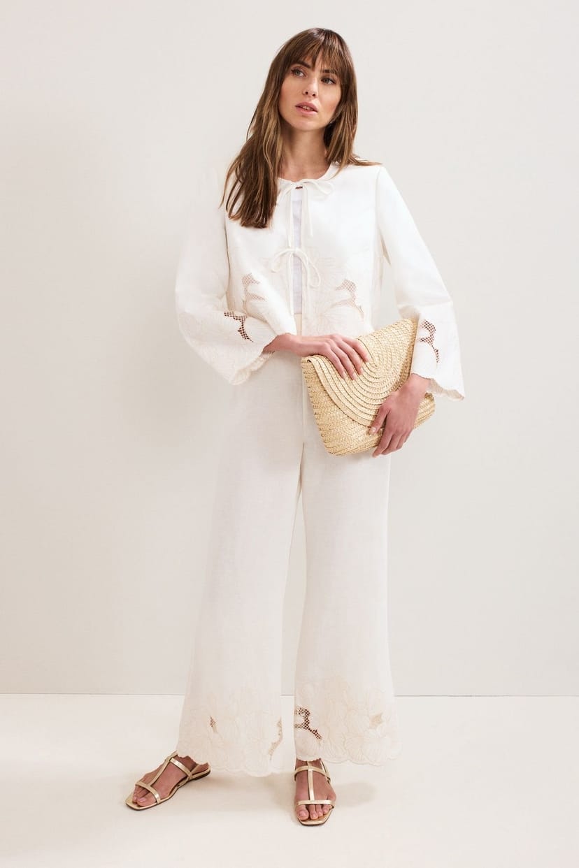 The Phase Eight White Wide-Leg Broderie Trousers is available in sizes 10, 12, 14, 16, 18, 8.