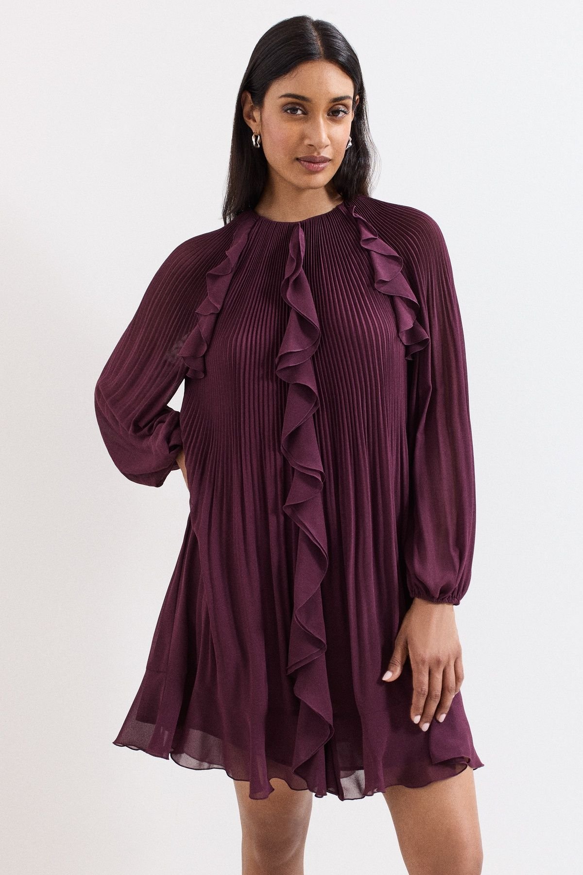 The Phase Eight Wine Frill Swing Dress is available in sizes 10, 12, 14, 16, 18, 8.