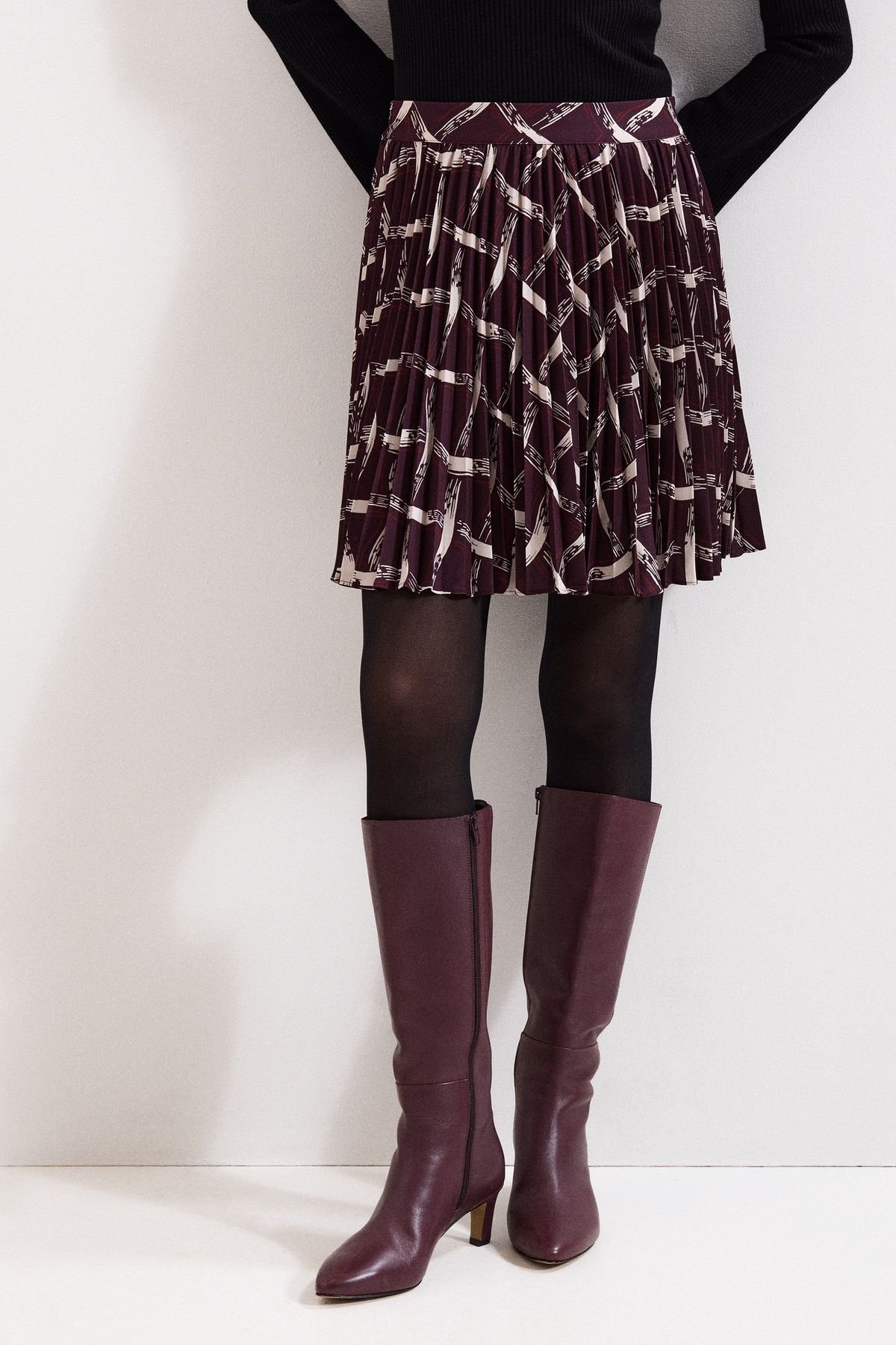 Trendy mini skirt in wine check print with a fully pleated design for soft movement. Ideal for pairing with knee-high boots. Perfect for casual outings.