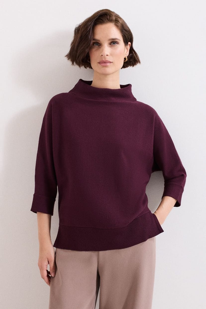 Trendy burgundy knit jumper with a relaxed fit, funnel neck, and 3/4 length sleeves. Perfect for everyday wear, style it with trousers and boots for an elevated look.
