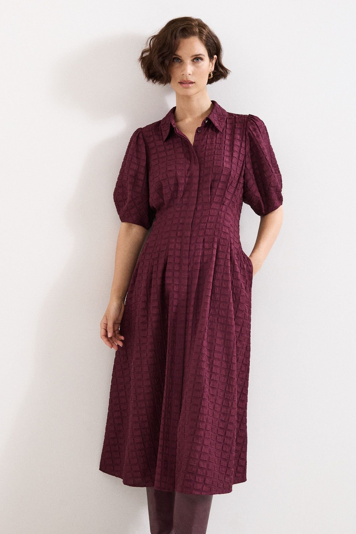 Stylish wine textured collared midi dress with a subtle pleating on the bodice for a streamlined fit. Features puff sleeves for added volume. Ideal for elegant autumn dressing.