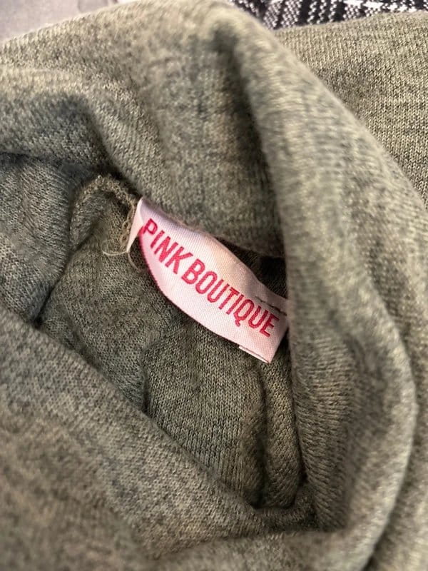 Stylish Pink Boutique hoodie in grey featuring a knitted fabric with a ribbed texture at the cuffs and hem. Perfect for casual wear with its relaxed fit and comfortable feel.