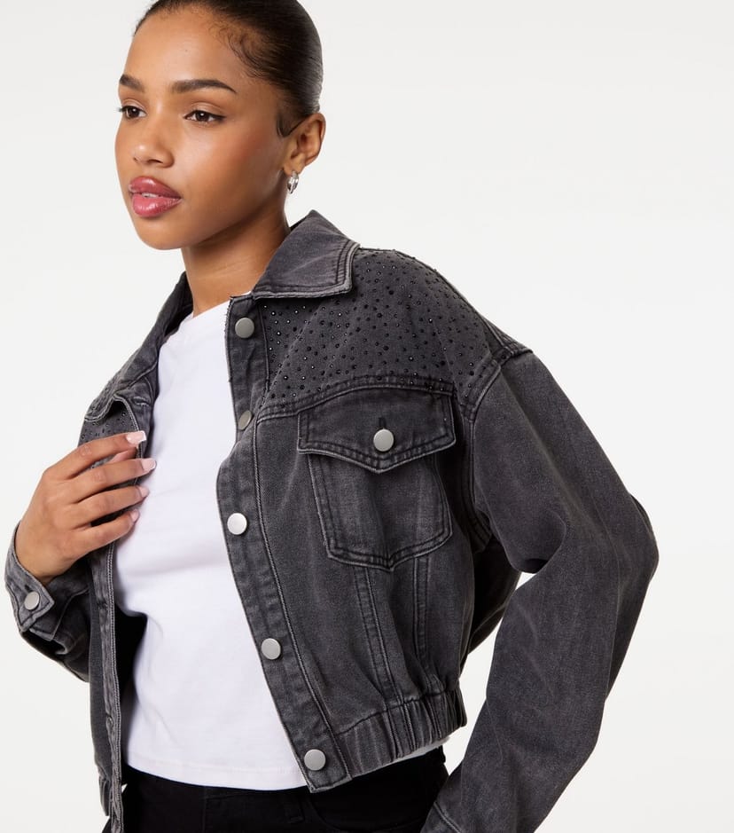 A cropped denim jacket with a sparkly twist. Pink Vanilla's black diamanté-embellished style features an elasticated hem and buttoned chest pockets. Ideal for casual outings.