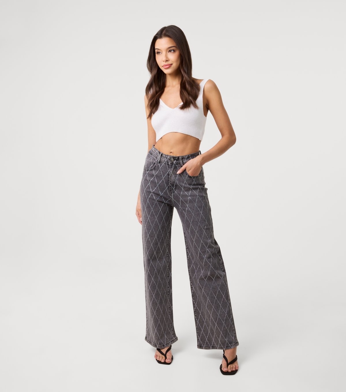 Trendy black washed jeans from Pink Vanilla featuring a diamond pattern of diamantes for a sparkling finish. These relaxed-fit jeans have a full length and wide leg style. Ideal for casual outings.