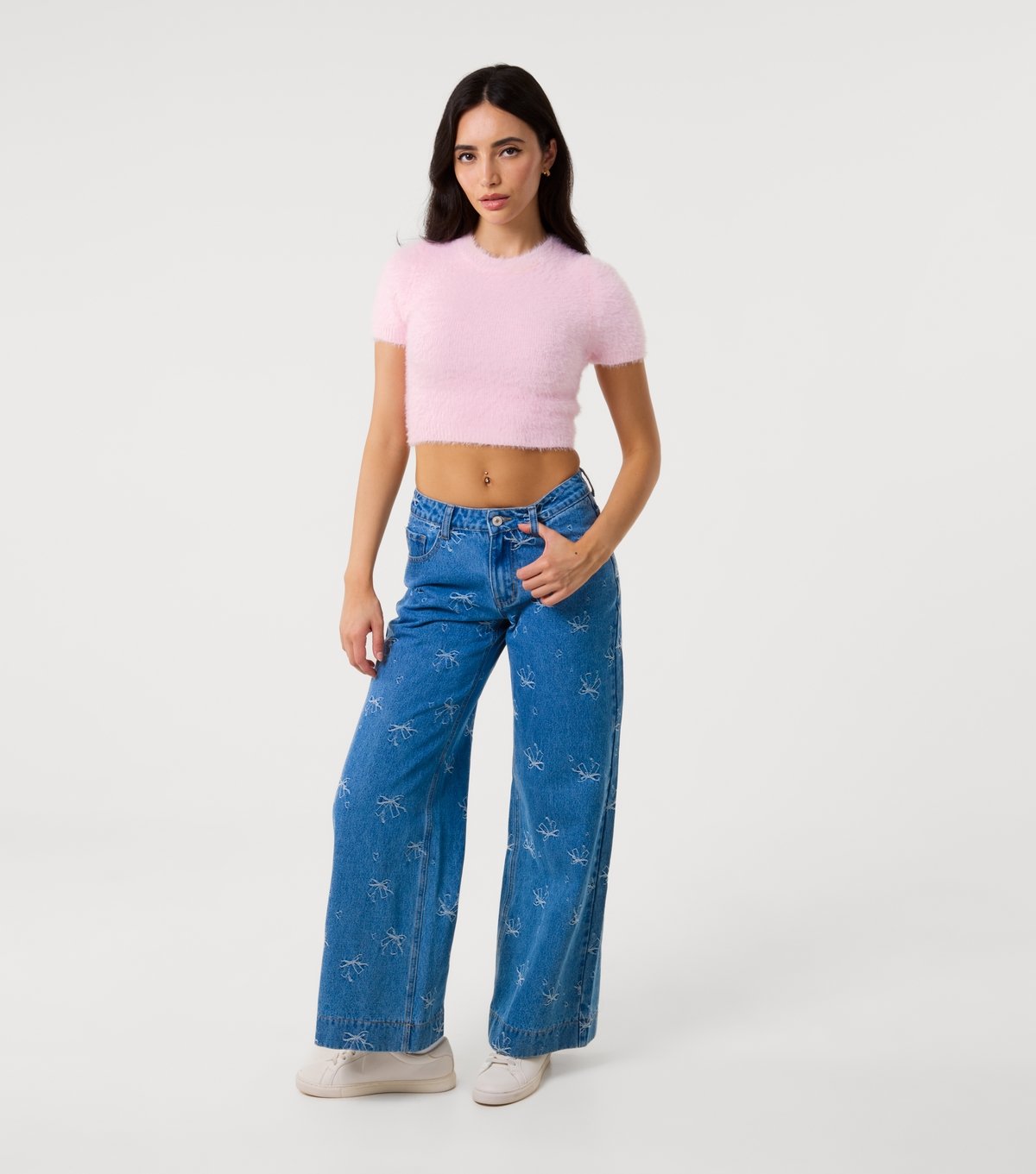 Stylish blue denim jeans from Pink Vanilla featuring charming ribbon bow embroidery. Designed for a relaxed fit, these jeans are perfect for casual days or weekend lounging.