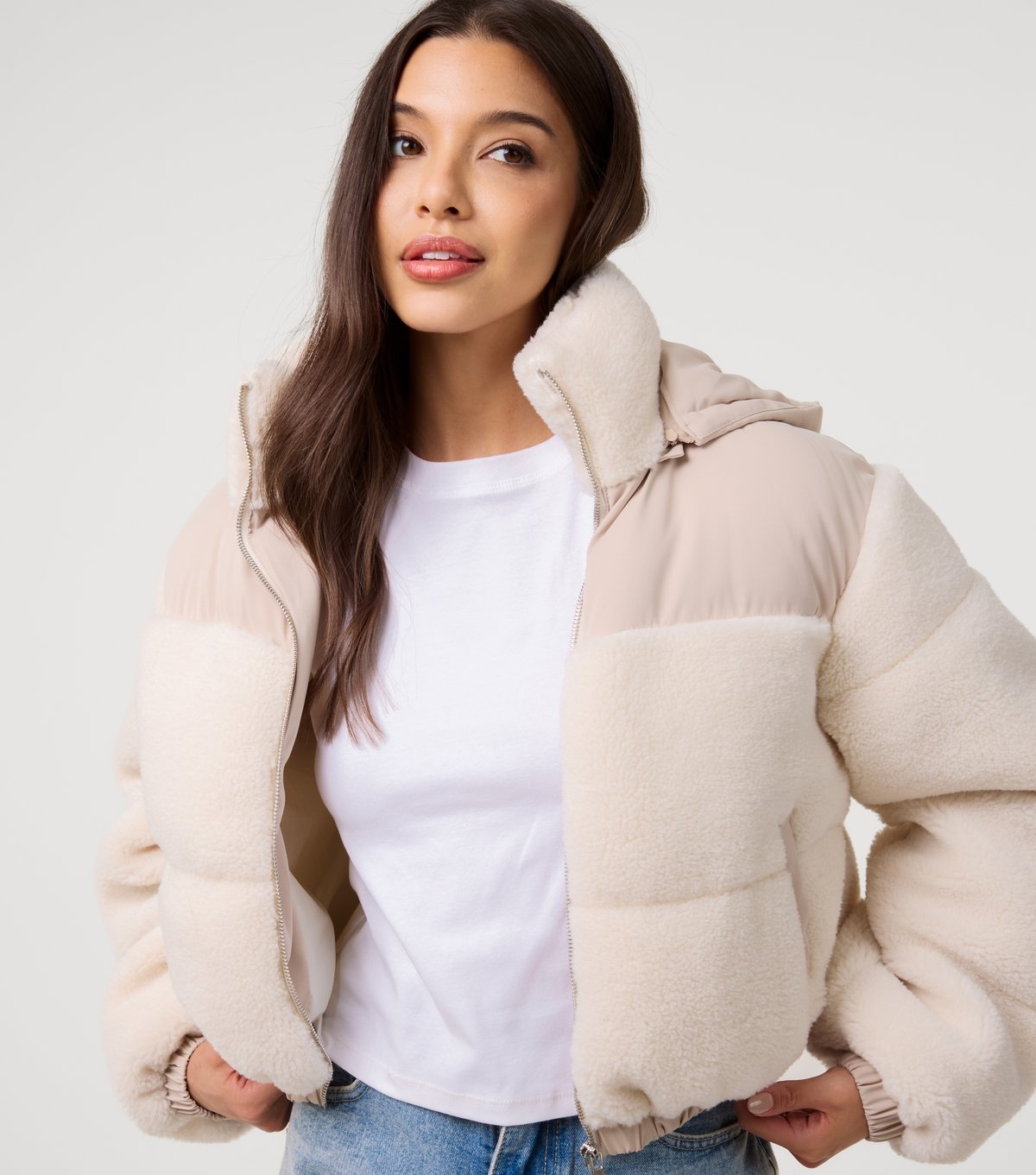 This cream faux fur hooded coat by Pink Vanilla is a cozy addition to your winter wardrobe. Featuring a relaxed fit and a functional hood, it's perfect for cold weather.