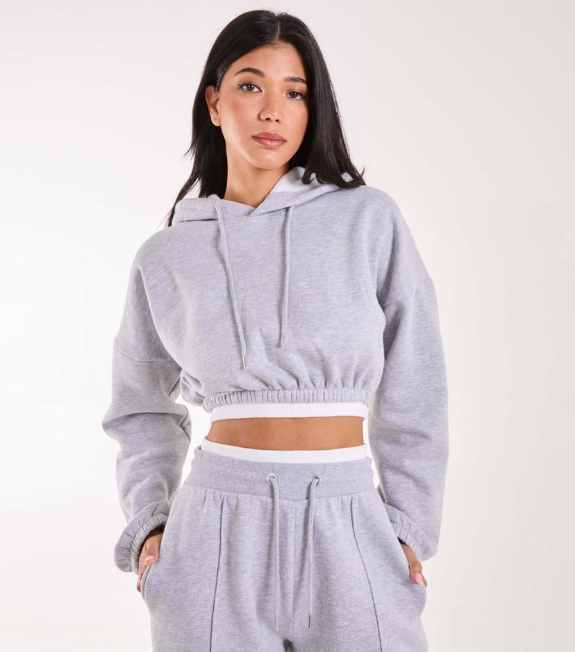Stylish crop hoodie in grey with a contrast band waist and drawstring details. The boxy fit and long sleeves make it perfect for casual wear.