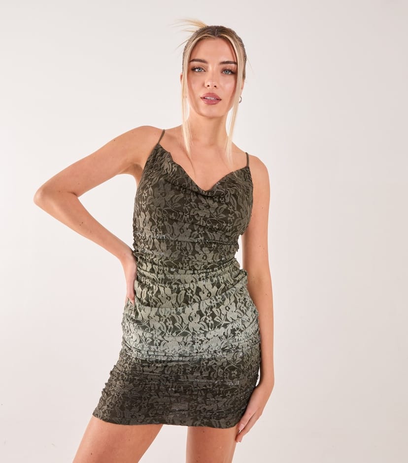 Stylish Pink Vanilla mini dress in khaki ombre with a cowl neckline and sleeveless design. Made from lined lace, this bodycon dress features a floral lace and ruching for a chic look. Ideal for evening events or casual outings.