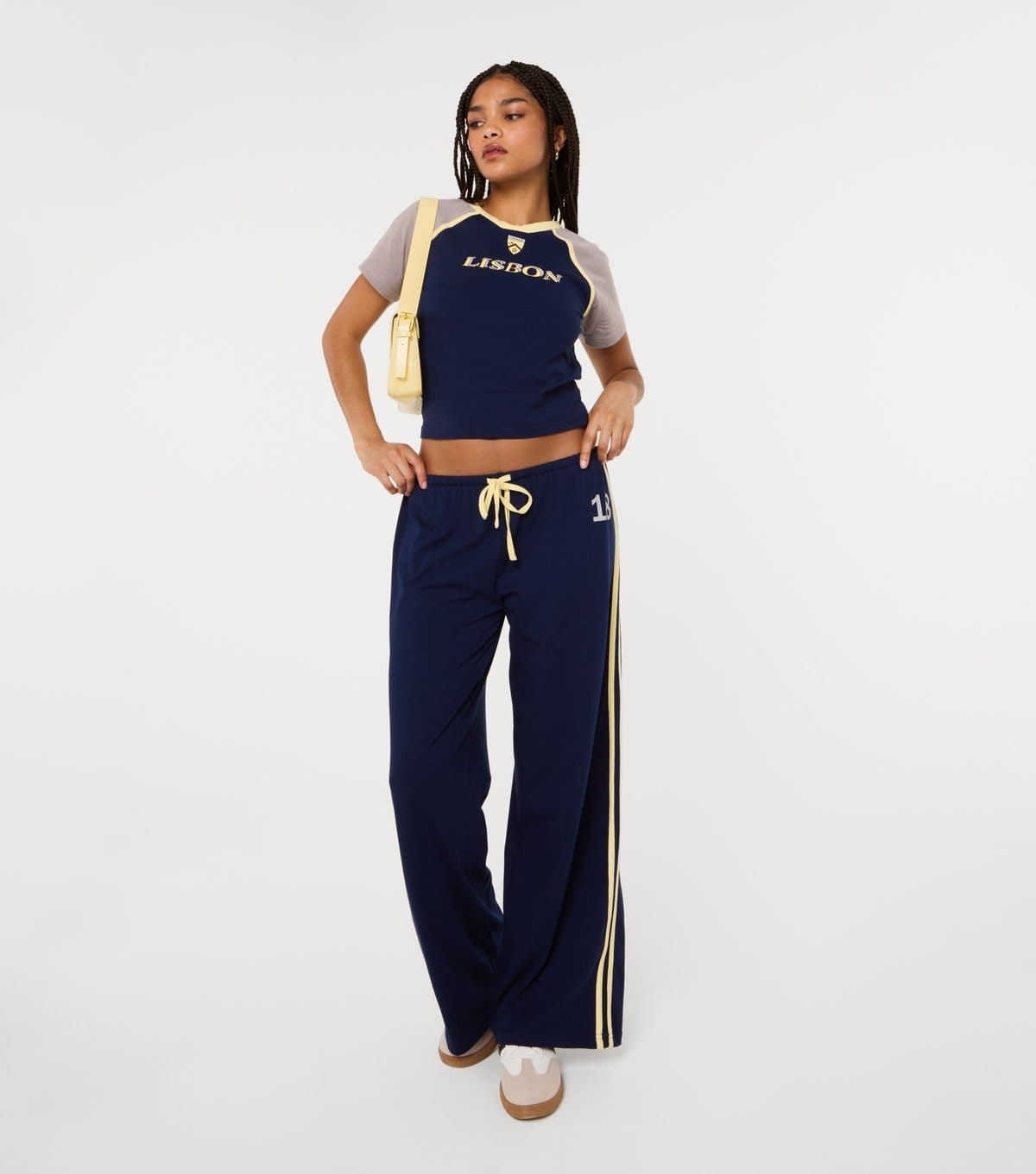 Pair with a matching navy jersey crop top and white trainers for a cohesive sporty look.