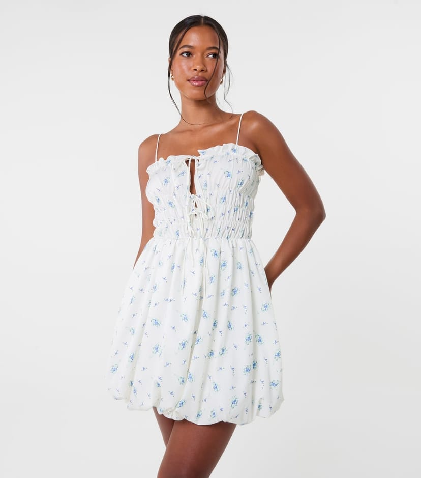 The Pink Vanilla White Floral Print Puffball Mini Dress is ideal for casual, beach, brunch.