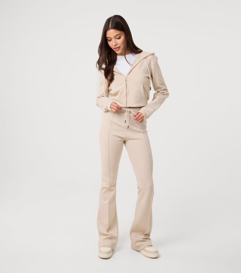 Stylish flare trousers in stone jersey by Pink Vanilla. Featuring a slim fit, mid-rise waist, and pintuck details, these trousers are perfect for a casual yet chic look.