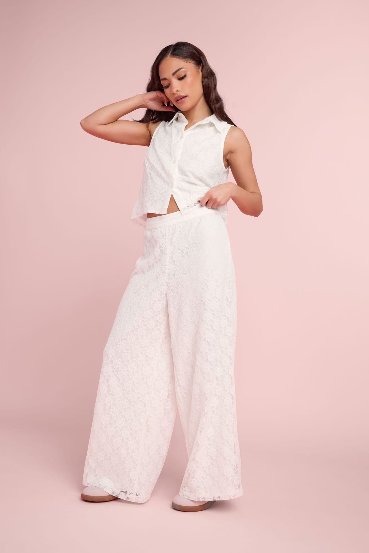 The PixieGirl White Lace Lined Shirt & Wide Leg Trousers Set is made from lace, polyester.