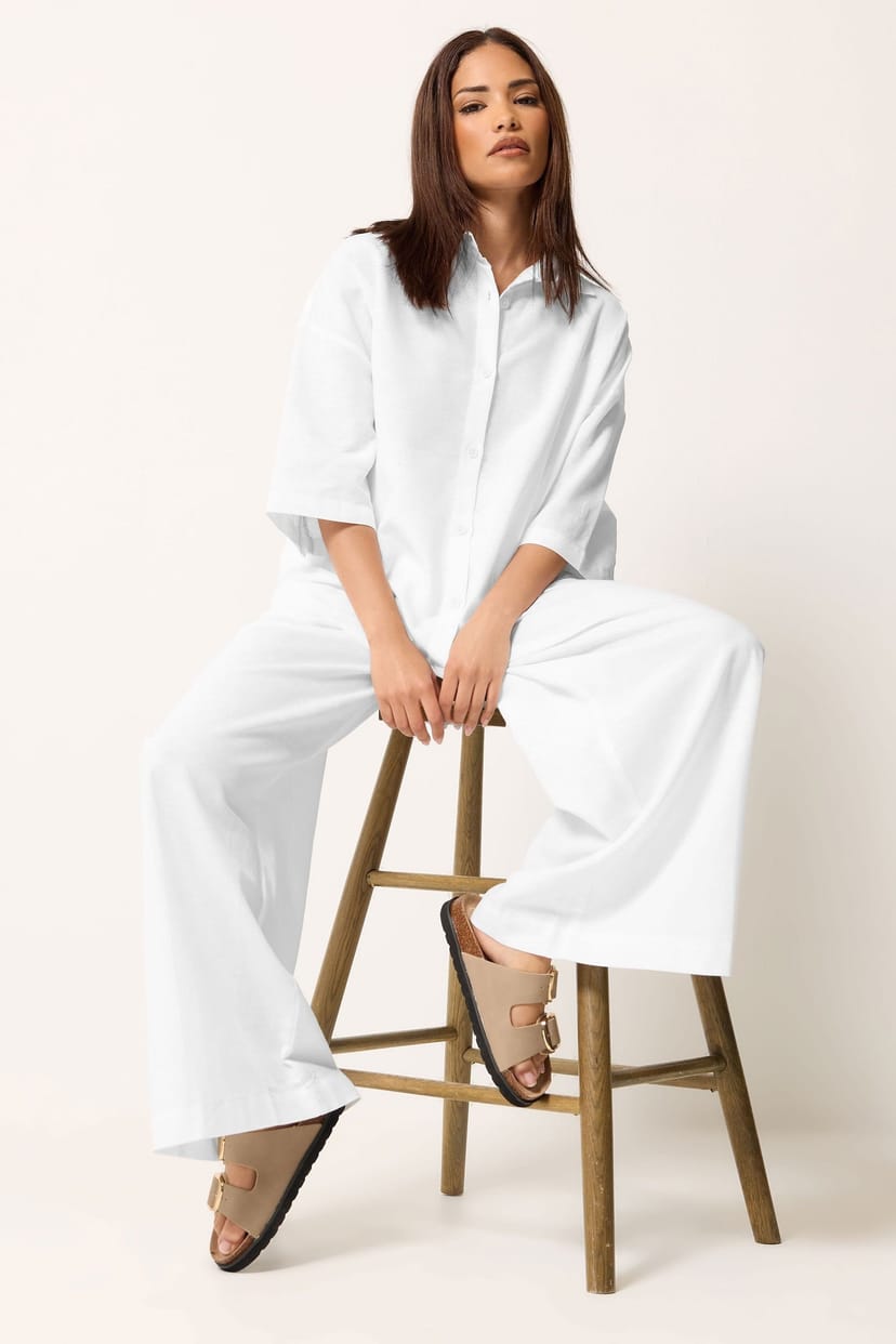This PixieGirl set features a white linen shirt and wide leg trousers, both in a crisp white hue. Designed for petite women, the shirt offers an easy fit while the trousers provide a relaxed, on-trend shape. Perfect for sunny-day styling.