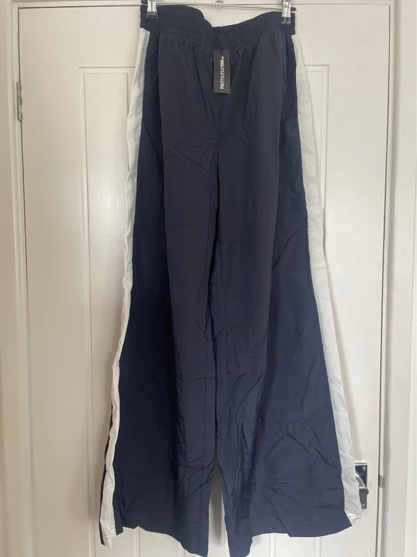 The PLT Parachute Pants feature a unique design with a navy blue hue and contrasting white panels. Perfect for a casual look, these pants have a relaxed fit that ensures comfort throughout the day.