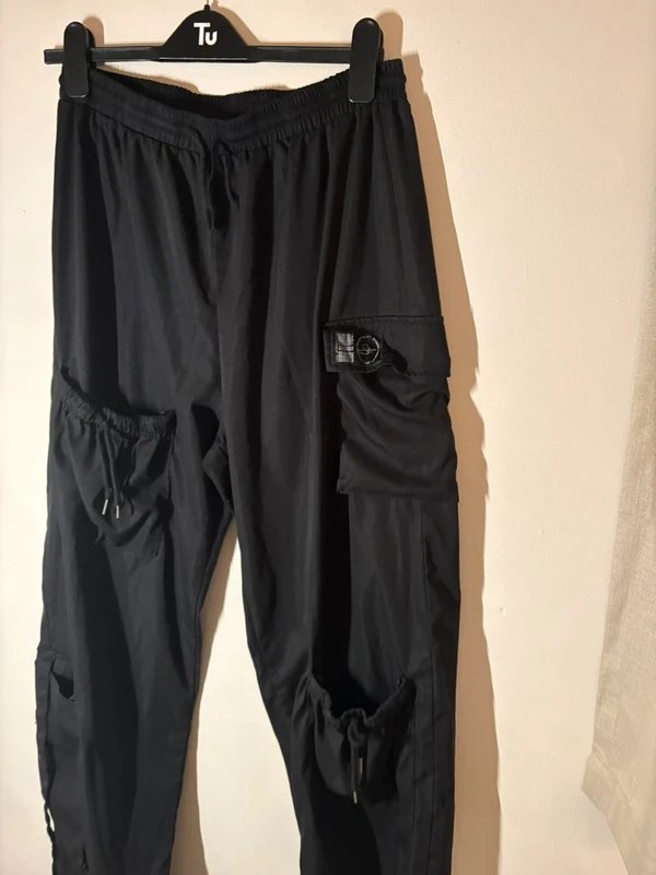 Crafted from durable material, these black cargo trousers feature multiple pockets and a comfortable fit. Ideal for casual outings or athleisure wear.