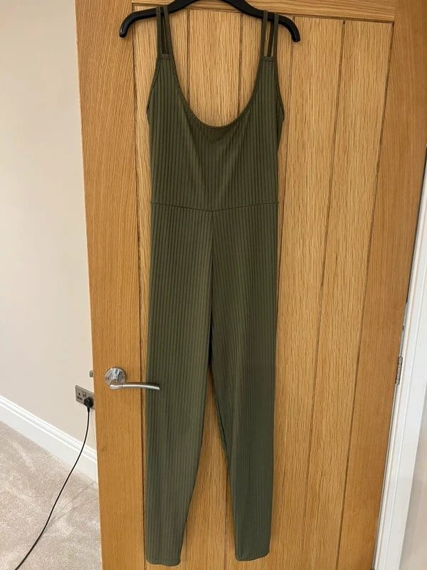 The PLT Khaki Ribbed Jumpsuit is ideal for casual, everyday, date-night.
