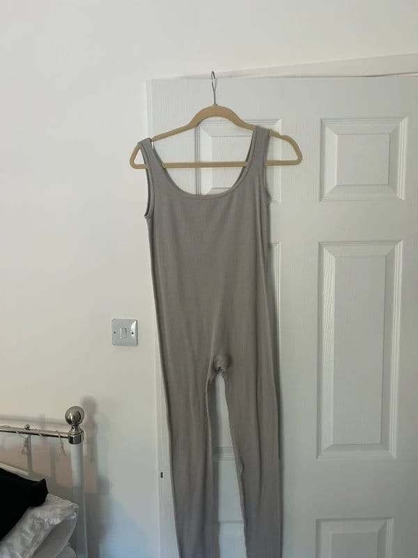 The PLT Ribbed Jumpsuit in Grey and Beige is available in sizes L.