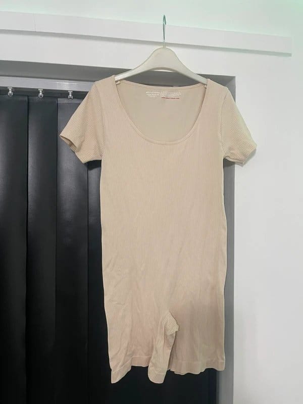 This beige stretchy playsuit from PLT features a scoop neckline and ribbed texture. Perfect for a casual yet chic look.