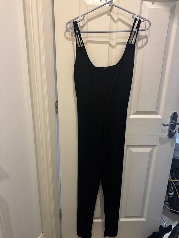 Stylish PLT black ribbed jumpsuit with a strapless neckline and adjustable shoulder straps. Made from ribbed fabric for a comfortable and flattering fit. Ideal for casual outings or evening events.