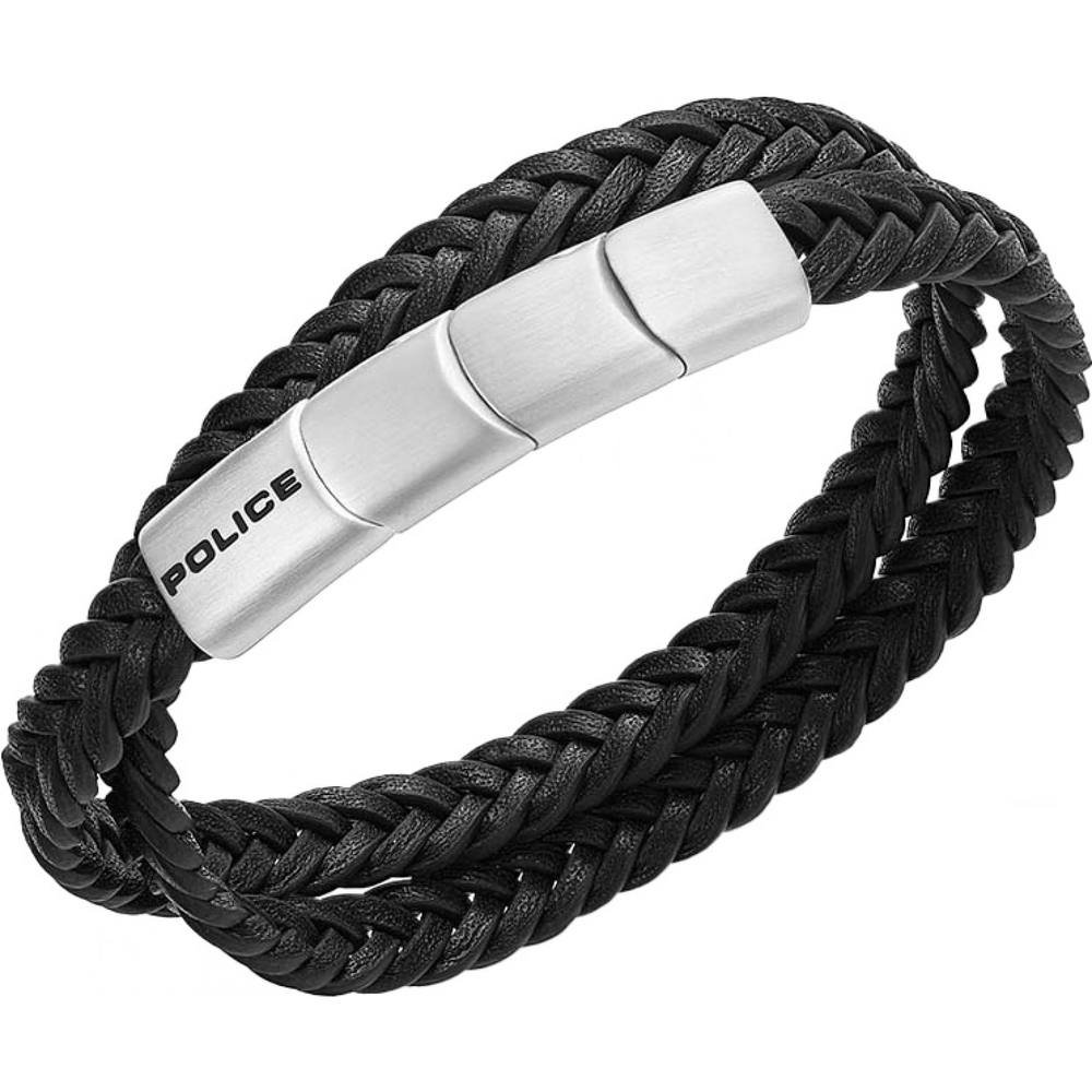 Timeless black braided leather bracelet from Police. Features a sleek stainless steel clasp with the brand logo. Perfect for a casual or smart-casual look.