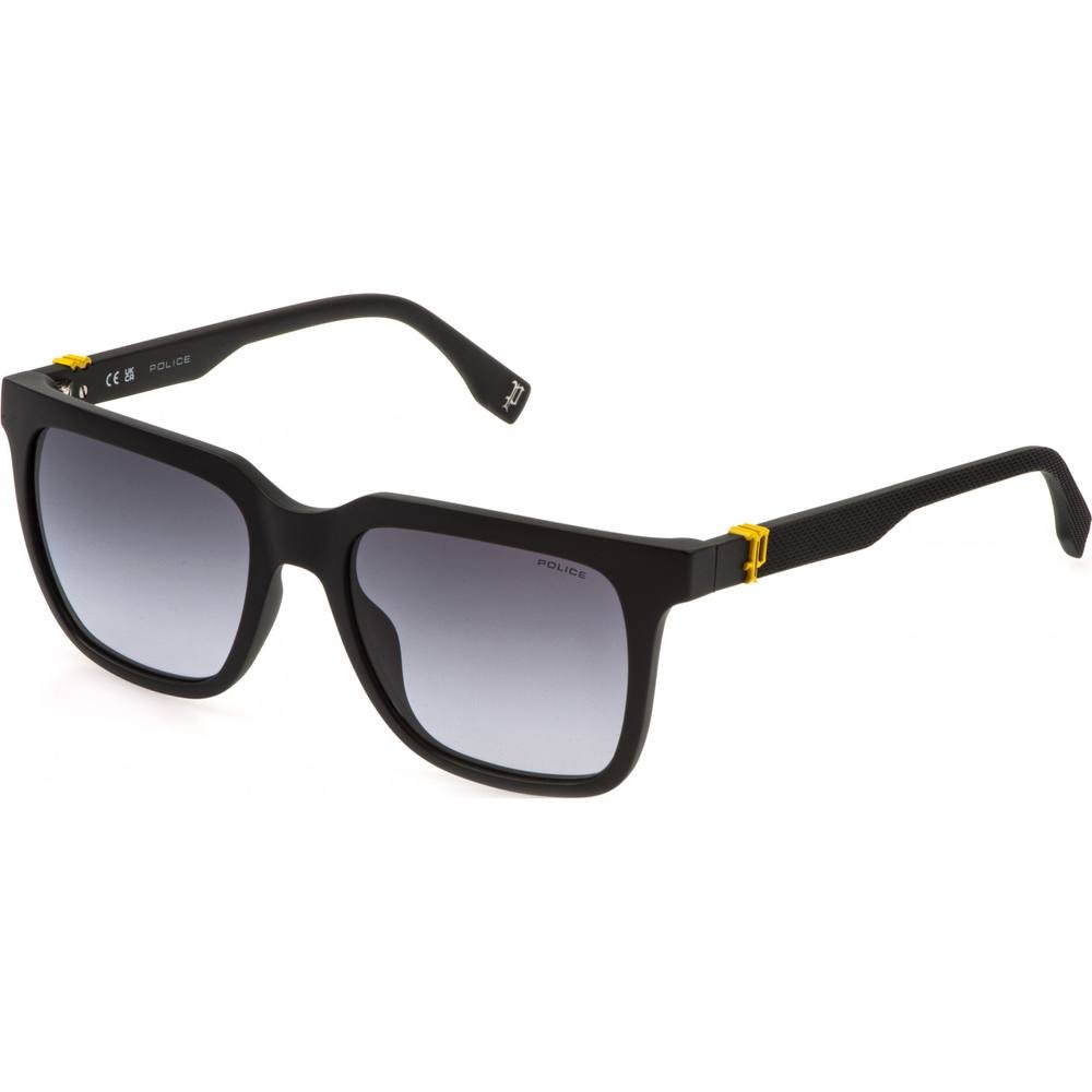 Stylish black square/rectangle sunglasses from Police. Featuring a sleek design with yellow accents and grey lenses, these sunglasses are perfect for a modern look.