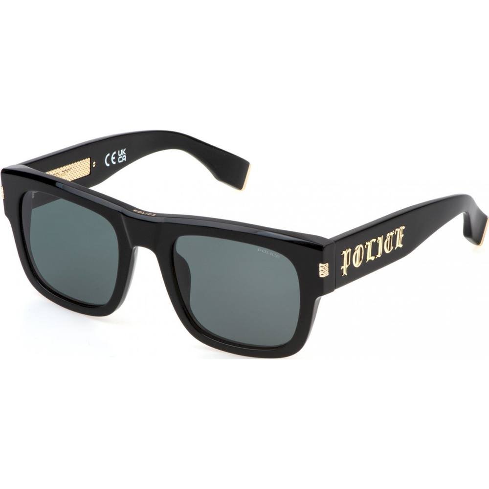 Stylish square-rectangle sunglasses from Police. Made from durable materials, these sunglasses feature a sleek black frame and gold accents. Ideal for a fashion-forward look.