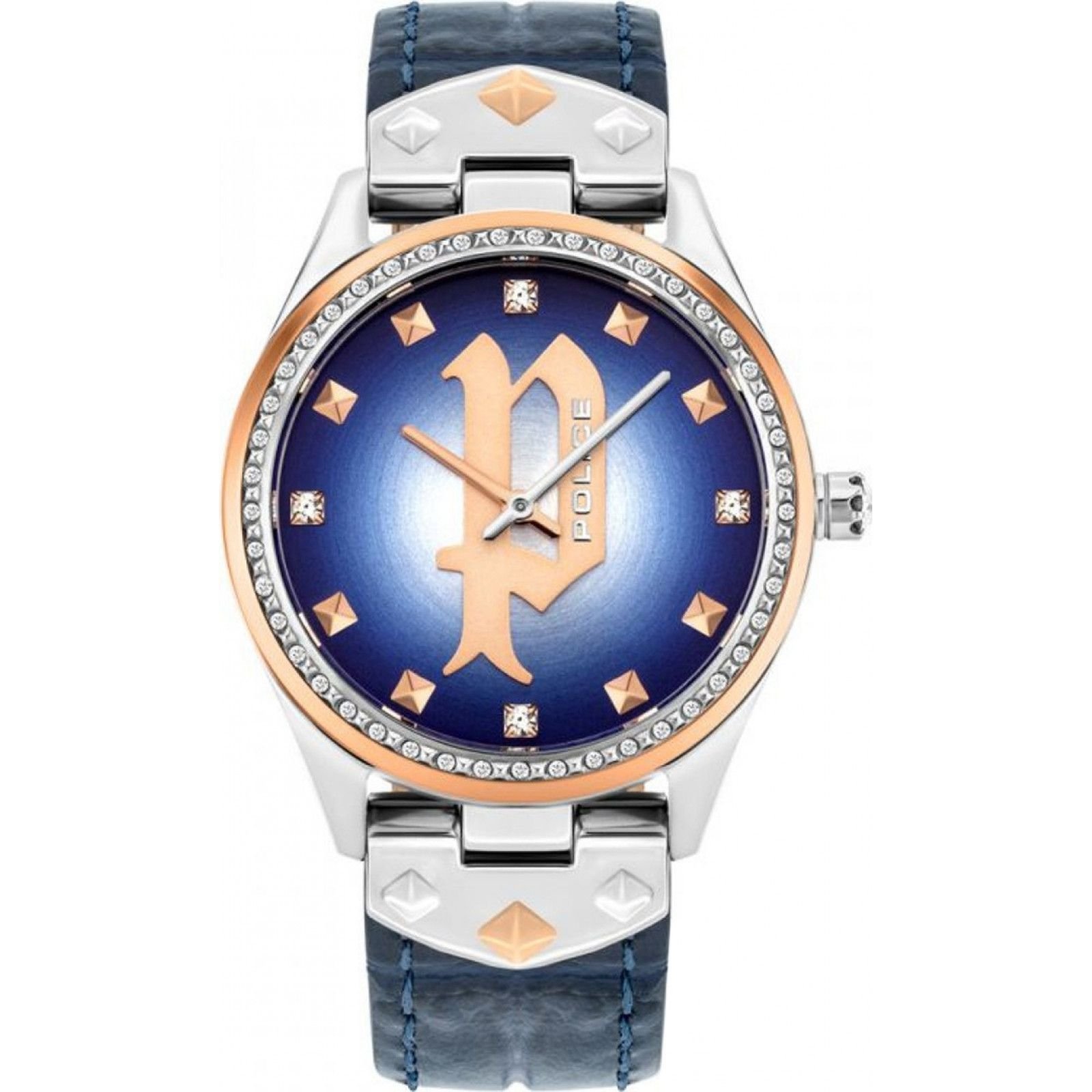 Stylish blue quartz watch from Police featuring a diamond-encrusted dial and rose gold accents. The leather strap adds a touch of elegance, making it perfect for any occasion.