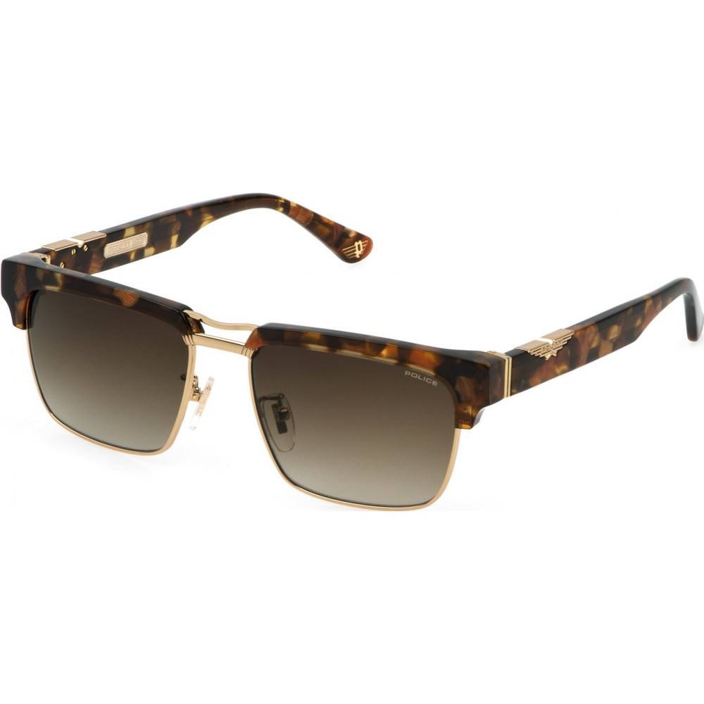 Stylish square/rectangle sunglasses by Police in brown. Featuring a bold frame and gold accents, these sunglasses are perfect for a modern look.