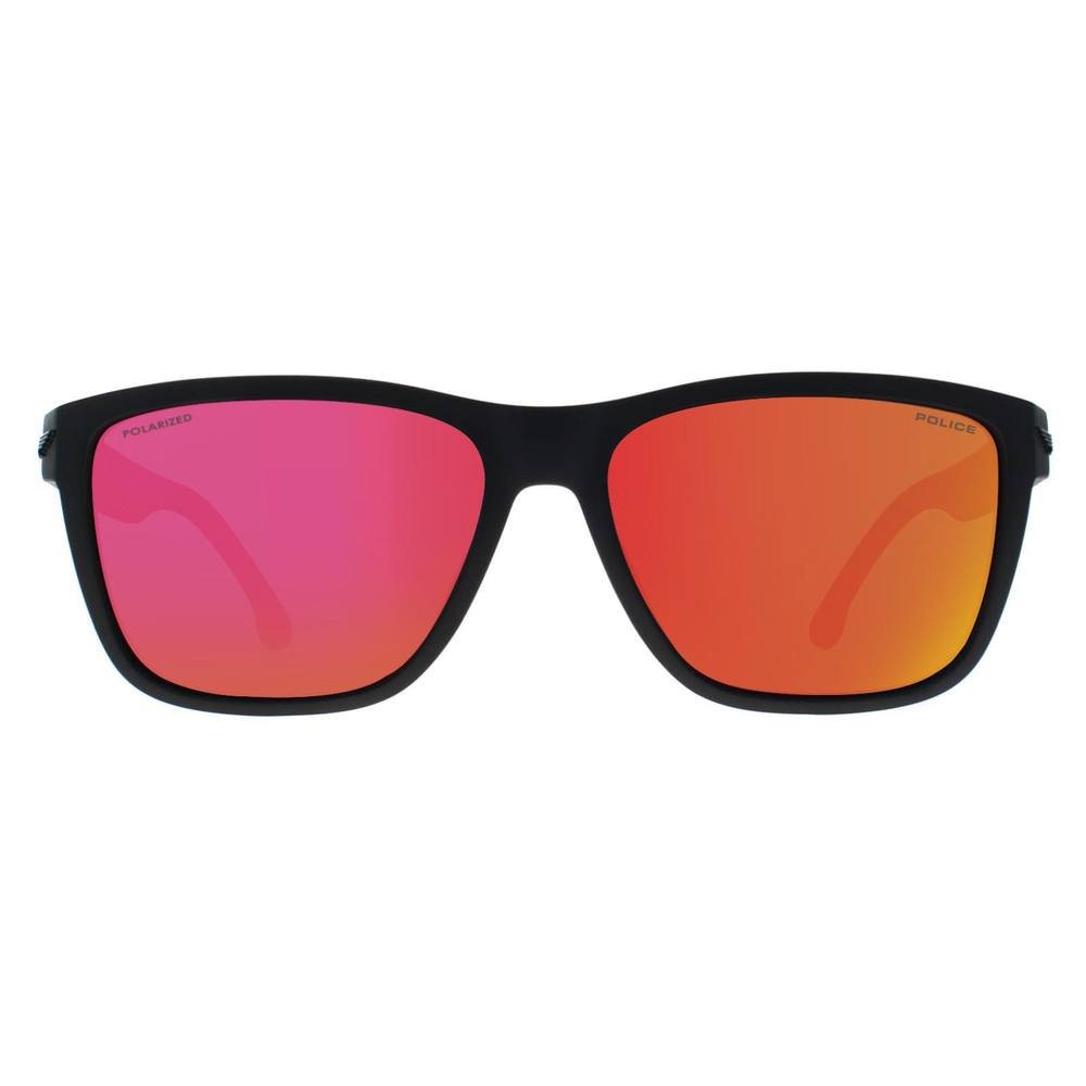 Classic rectangle matte grey sunglasses with multilayer red polarized lenses. Crafted from lightweight acetate with the iconic Police emblem on the temples.
