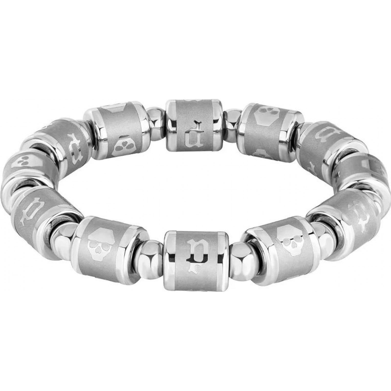 Elegant silver Police bracelet with a modern design. Crafted from high-quality materials, this bracelet features a series of cylindrical beads with engraved skull and crossbones motifs. Perfect for adding a touch of edgy sophistication to any outfit.