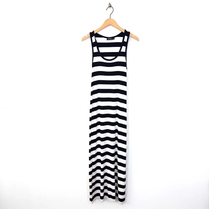 The Polo Ralph Lauren Black and White Striped Maxi Tank Dress is available in sizes S.