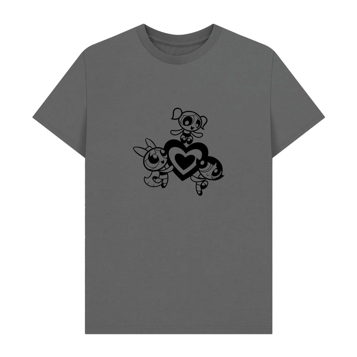 Casual men's t-shirt in charcoal featuring a printed Powerpuff Girls design. Made from 100% cotton for comfort and breathability. Ideal for everyday wear or casual outings.