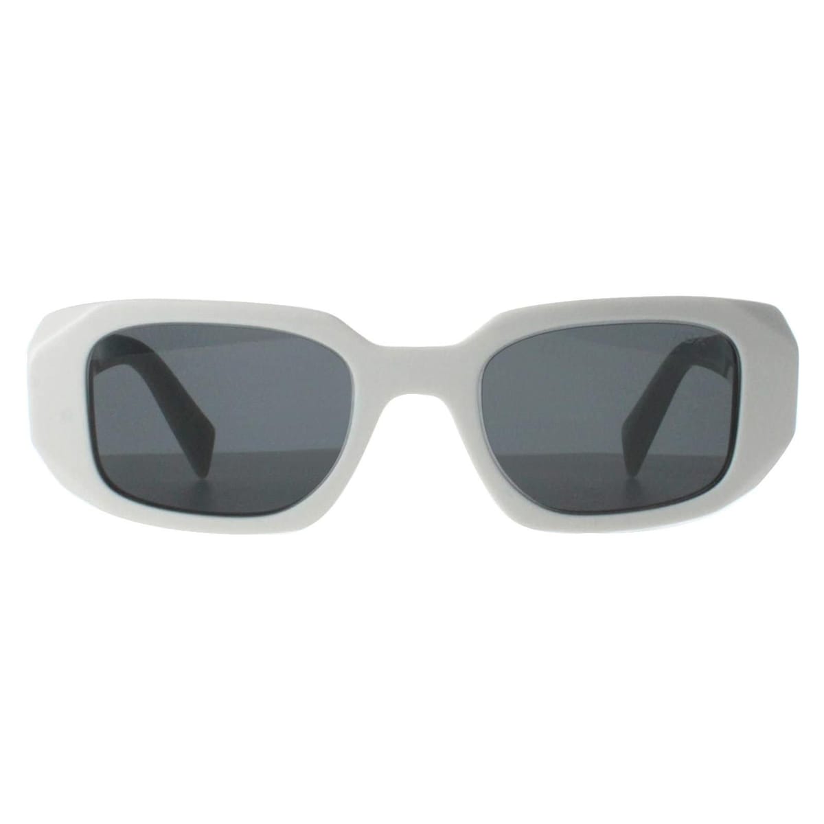 Sleek Prada Rectangle Talc Dark Grey PR17WS sunglasses in white with black lenses. Crafted from high-quality acetate, these sunglasses feature a rectangular frame and Prada logo on the temples. Ideal for any occasion, offering both style and durability.